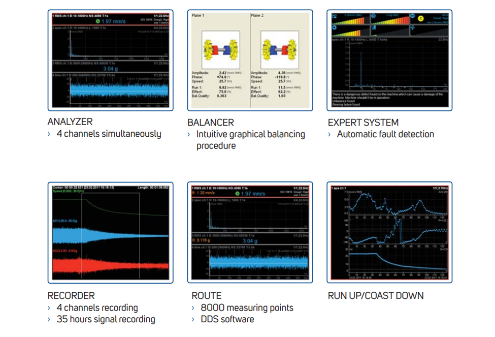 Parhoon Canada utilizes the latest vibration data collectors and signal analyzer based on sophisticated and refined technology. Our vibration analyzers have the proven features with the advantages of rapid processors and brilliant modules. Measure 4 vibration signal channels and 4 process value channels along with speed synchronously.